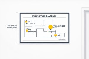 Ensure evacuation diagrams meet AS 3745-2010: correct 'YOU ARE HERE' orientation, marked exits and equipment, proper mounting (1200–1600mm) and timely updates.