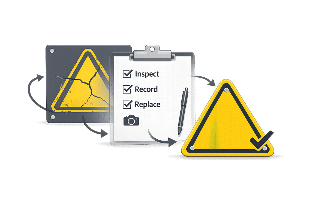 Regularly inspecting and reporting damaged signs is not just recommended – it’s legally required under the PCBU’s duty of care. Keeping detailed records of inspections and replacements not only ensures compliance during audits but also serves as proof that your business has taken all reasonable steps to maintain safety standards [2]. These records play a vital role in the inspection process discussed further in the next section.