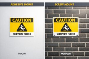 Compare adhesive and screw mounting for safety signs — pros, cons, durability, surface suitability and AS 1319 compliance for indoor and outdoor use.