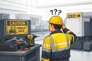 Placement errors are common and include mounting signs on doors or windows (which can shift out of view), placing them where they might be obscured by stacked materials or equipment, or not ensuring they contrast with the background [13]. In areas with vehicle or forklift traffic, signs need to be larger because operators moving at speed can’t easily read smaller text or symbols compared to workers on foot [12].