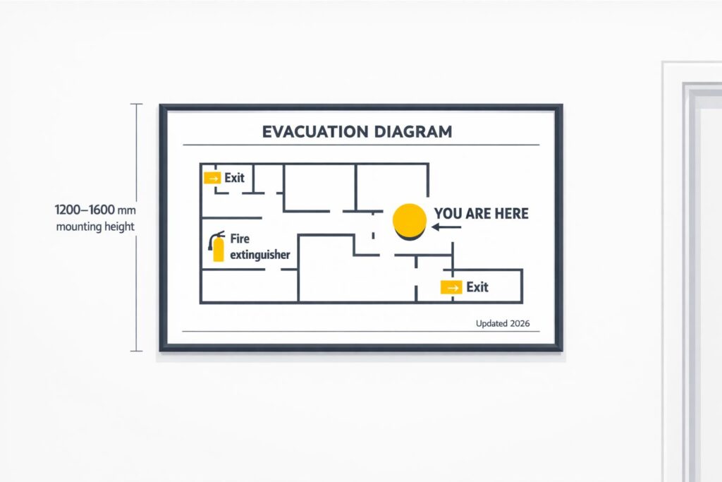 "The evacuation diagram should be positioned at a height not less than 1200 mm and not more than 1600 mm above the floor." – CMG Fire and Safety [5]