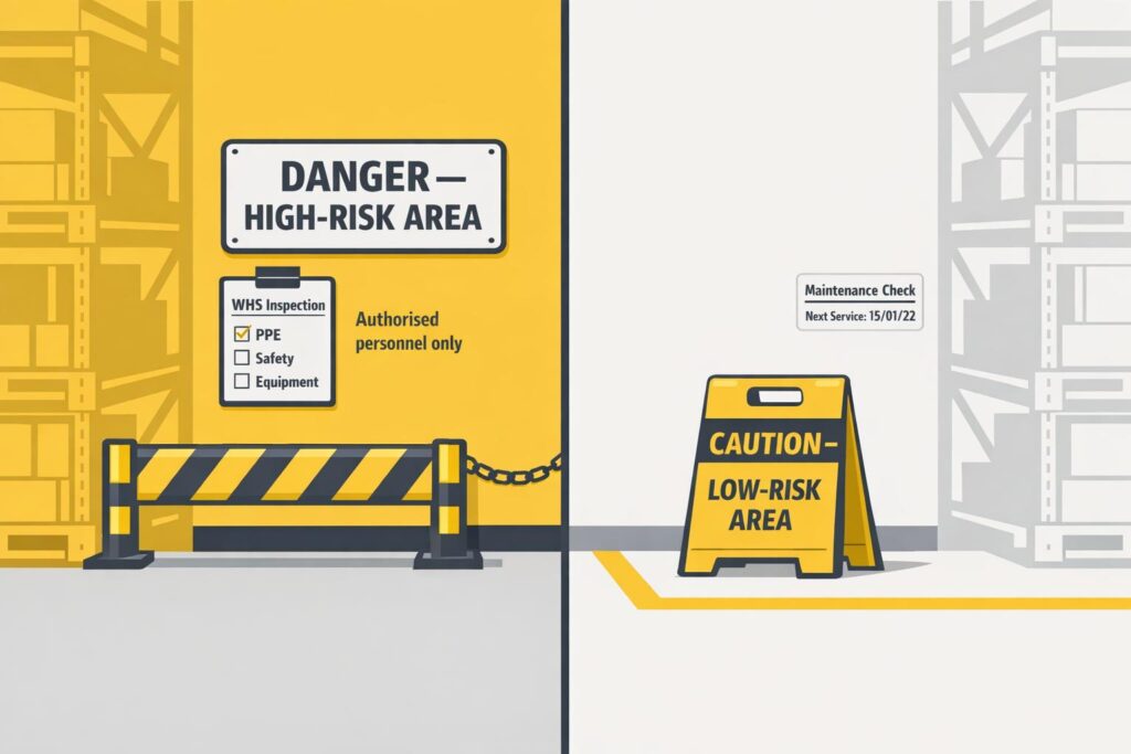 When it comes to Workplace Health and Safety (WHS) compliance, the design and material of signage play a critical role in ensuring hazards are recognised immediately. Understanding the differences between high-risk and low-risk signage goes beyond appearances – it’s about protecting workers from serious harm. High-risk signs indicate situations that, if ignored, could result in severe injury or death, while low-risk signs warn of potential hazards that might cause minor to moderate injuries [4].