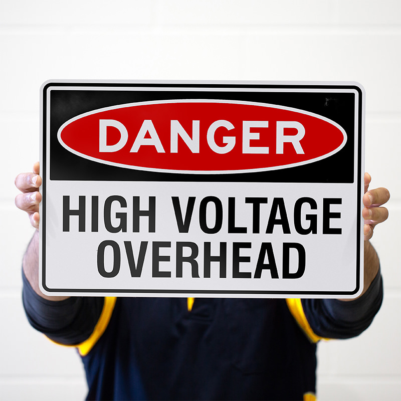 This DANGER – High Voltage Overhead metal sign is a must have for any workplace or facility with potential electrical hazards. Constructed from 1.6mm thick aluminium, it is both durable and firm, ensuring long lasting use. The high quality digital print is applied to the surface using vinyl, and then coated with a UV laminate film to protect it from fading and damage due to exposure to sunlight and other elements.
