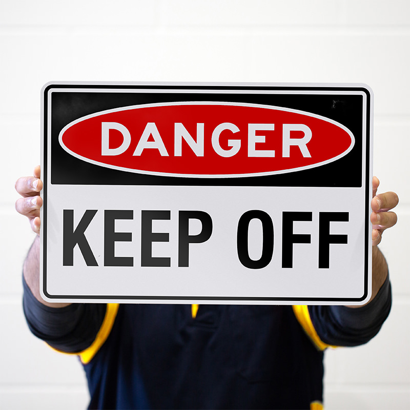 This sturdy Danger – Keep Off metal sign is perfect for warning others to stay clear of a dangerous area. Made from 1.6mm thick aluminium, it is firm and durable. The high quality vinyl digital print is laminated with a UV laminate film to protect the design from fading and weather damage. Also the metal sign features rounded corners for safety.