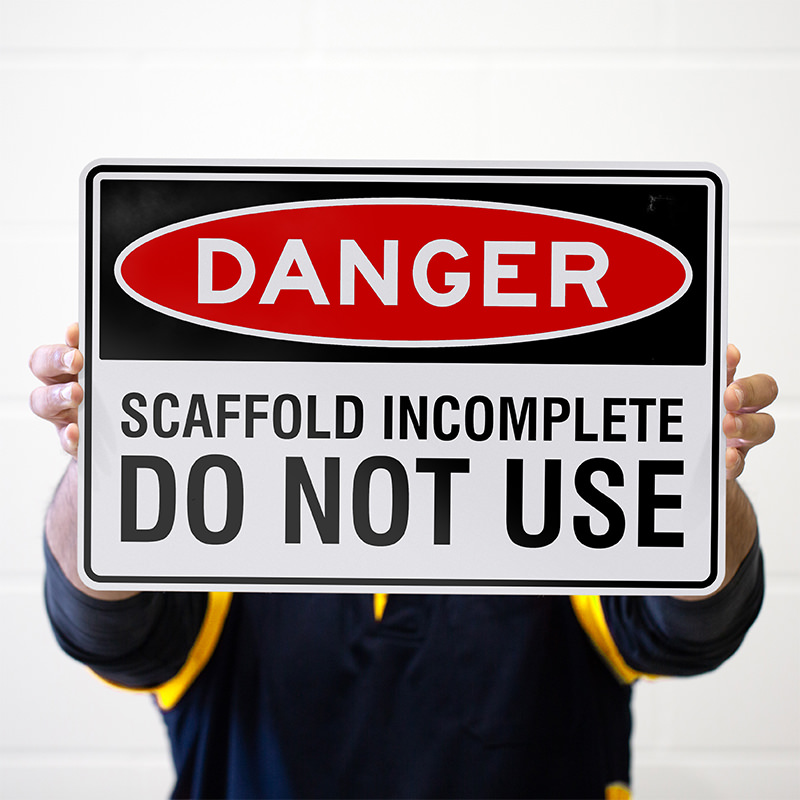 Ensure safety in the workplace or construction site with this durable and high quality Danger – Scaffolding Incomplete metal safety sign. Made from 1.6mm aluminium, this sign is firm and built to last. The sign features a digital print on high quality vinyl, ensuring clear and vibrant visibility. To protect the print from fading or damage the sign is laminated with a UV laminate film. The metal sign also has rounded corners for added safety to prevent any sharp edges from causing harm.