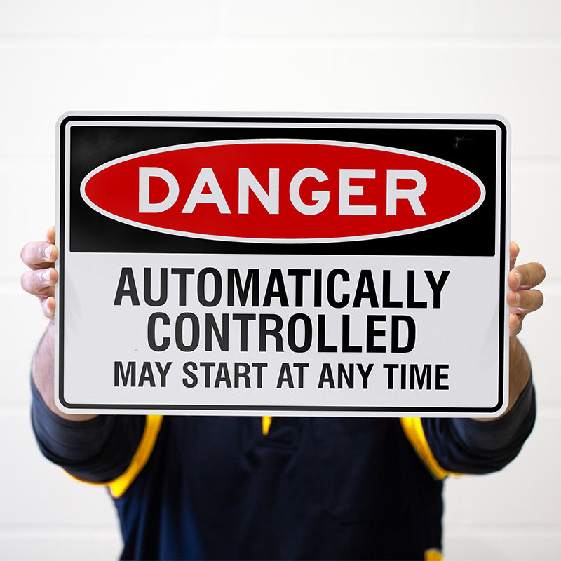 This durable and eye catching metal sign is the perfect addition to any workplace or industrial setting. Made from sturdy 1.6mm aluminium, this sign is built to last and withstand tough conditions. The vibrant digital print on high quality vinyl ensures that the warning message DANGER – Automatically Controlled May Start At Any Time is clear and easy to read. To protect the print from fading and damage, the sign is laminated with a UV laminate film. With rounded corners for safety, this metal sign is both functional and safe.