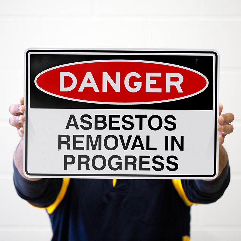Stay safe and informed with our DANGER – Asbestos Removal In Progress metal sign. Made from durable 1.6mm aluminium, this sign is firm and built to last. The digital print on high quality vinyl ensures a crisp and clear message that will draw attention. For added protection, the sign is laminated with a UV laminate film to shield the print from fading or damage.