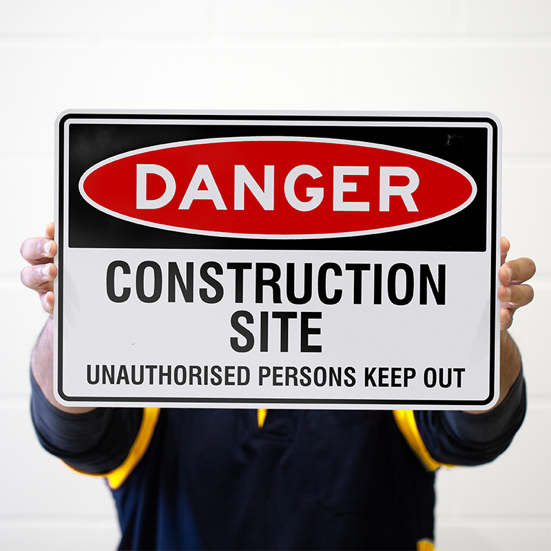 Introducing our DANGER Construction Site metal sign, designed to keep unauthorized persons out of your construction site. This durable sign is made from 1.6mm aluminium, making it sturdy and long lasting. Featuring a digital print on high quality vinyl, the sign is laminated with a UV laminate film to protect the print from fading and damage caused by the sun and other weather elements. The metal sign also has rounded corners for safety, reducing the risk of sharp edges.