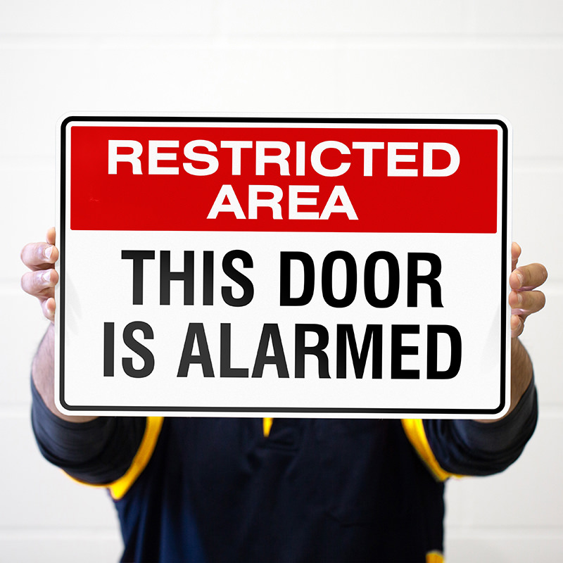 Secure your entry points with the This Door Is Alarmed sign. Crafted from tough aluminium, this sign clearly indicates that the door is protected by an alarm system, serving as a strong deterrent against unauthorized access.