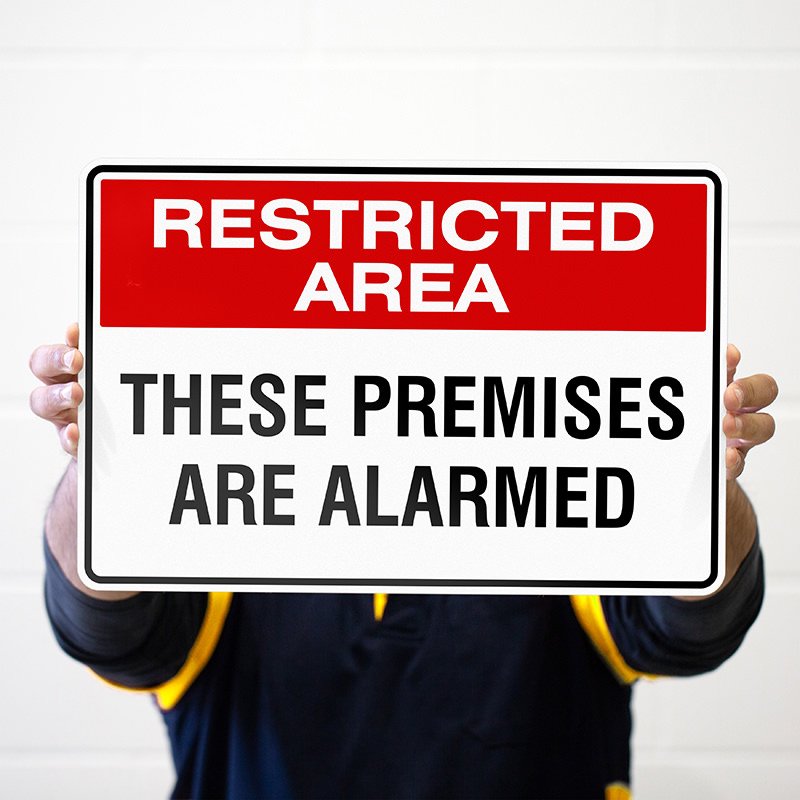 Deter intruders using the These Premises Are Alarmed sign. Made from sturdy aluminium, this sign effectively warns that your property is equipped with an alarm system, serving as a powerful deterrent to unauthorized access.