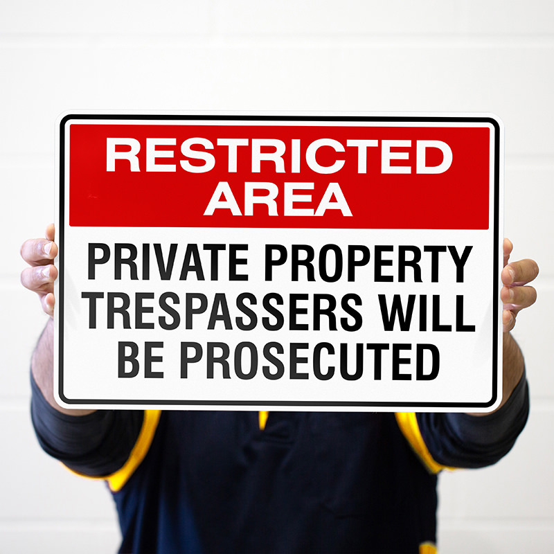 Clearly mark your boundaries with the Private Property Trespassers Will Be Prosecuted sign. Crafted from tough aluminium, this sign serves as a firm deterrent against unauthorized access, making it clear that trespassing on your property will not be tolerated.