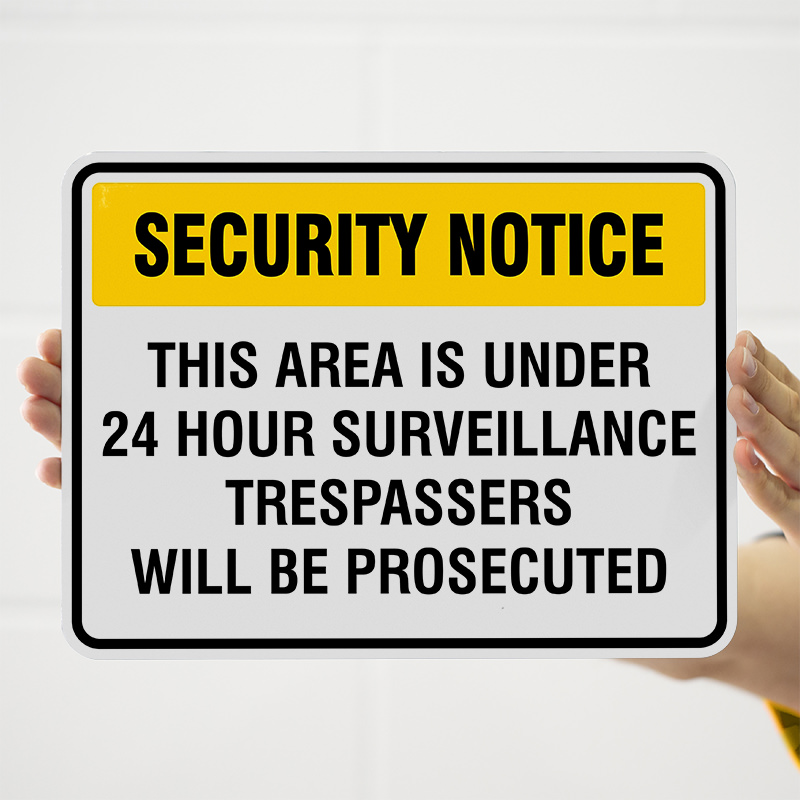 Ensure surveillance is noticed with our This Area Is Under 24 Hour Surveillance sign. Constructed from tough aluminium, this sign features a high quality digital print and UV laminate to ensure it stands up to all weather conditions while staying clear and legible.