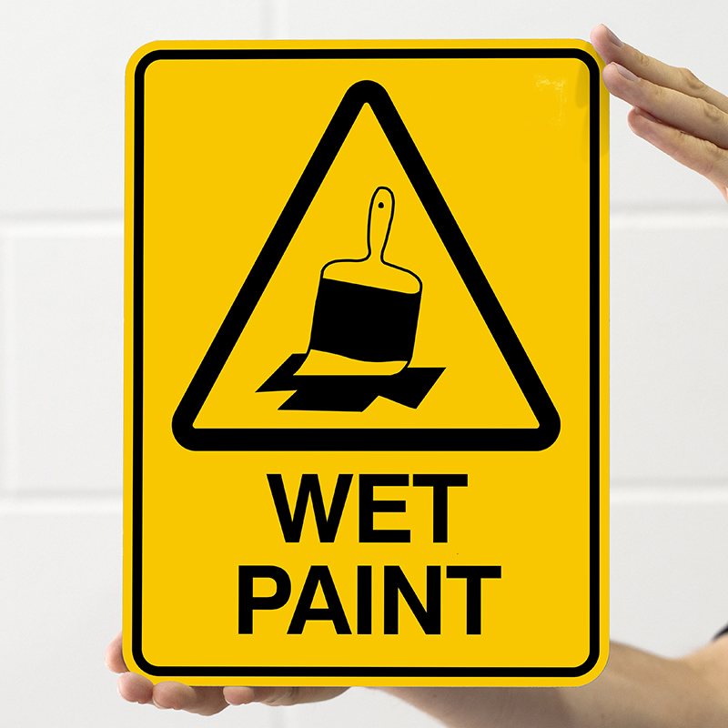 Prevent accidental contact with freshly painted surfaces using our Wet Paint sign. Designed for durability, this metal sign boasts a vivid digital print on vinyl, shielded by a protective UV laminate. Rounded corners provide additional safety.