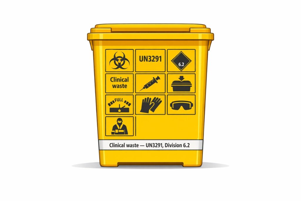 - UN3291 Clinical Waste Marking: Used for infectious substances (Category B); mandatory for bins and transport.